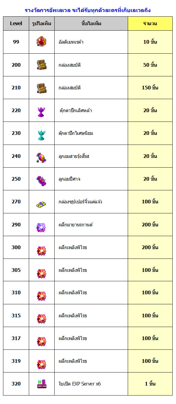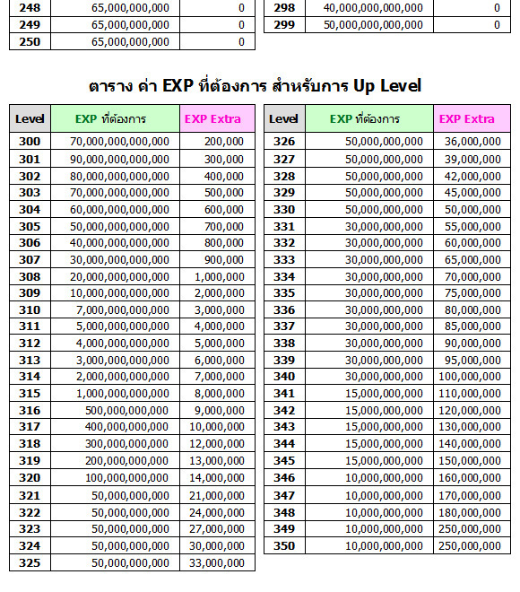 สำหรับตาราง EXP นี้ เป็นข้อมูลล่าสุด (ณ วันที่ 14 มิถุนายน 2565) ซึ่งแต่เดิมไม่เคยมีการเปิดเผย ข้อมูลส่วนนี้มาก่อน แต่ปัจจุบัน MAX Level ได้กำหนดออกมาชัดเจนแล้วว่า จะสูงสุดที่ Level 350 ดังนั้นจึงทำตารางการอัพเวลออกมาให้เพื่อนๆ ได้นำไปวางแผนการเล่นเกม กันต่อไป ซึ่งตารางนี้มีการปรับลดปริมาณลงเยอะมาก ก็หวังว่าจะช่วยทำให้การเล่นเกมสนุกสนานยิ่งขึ้น และง่ายขึ้นอีกหน่อย ^^ งานนี้ สนุกแน่นอนครับ ^^